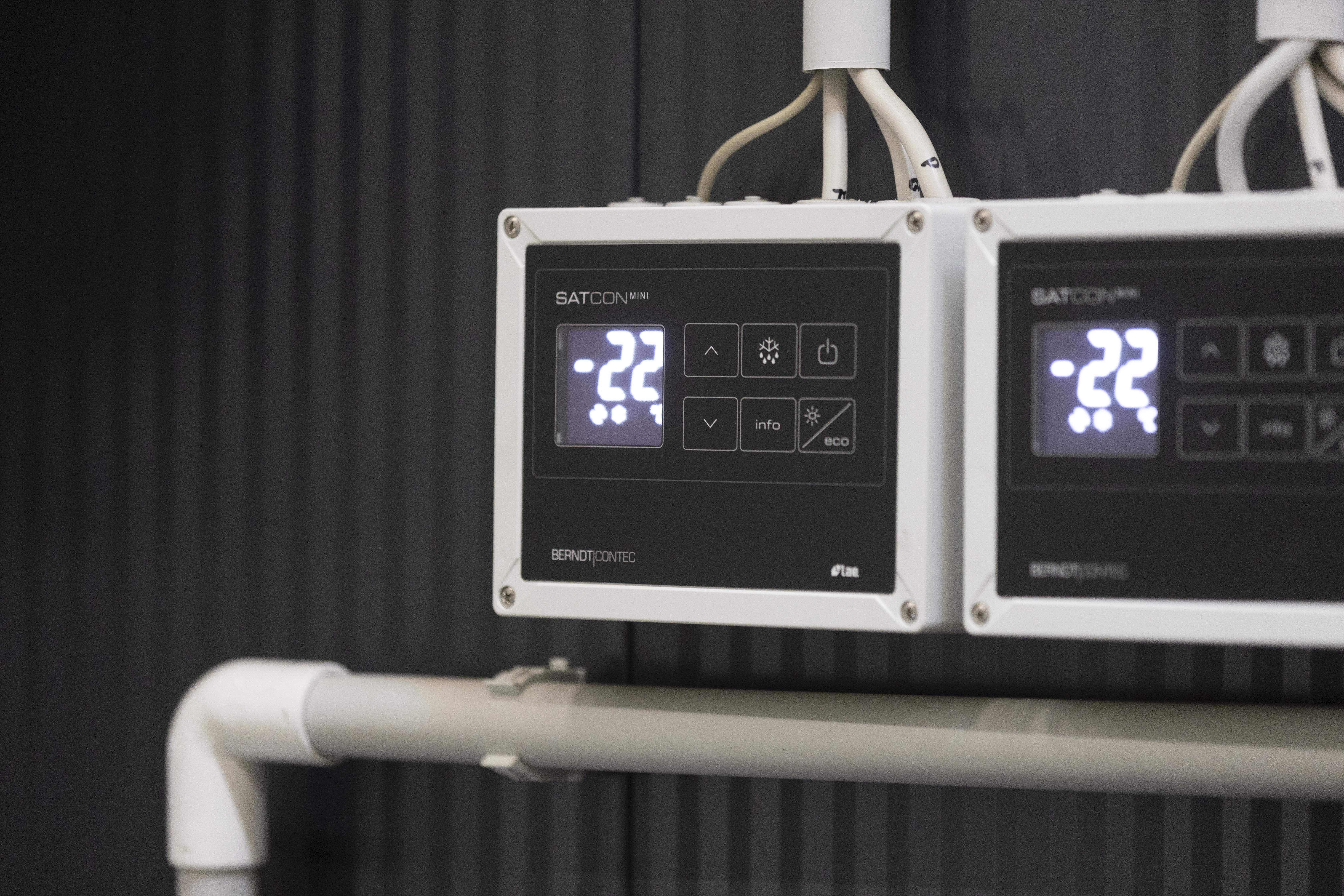 The image shows two digital control panels, labeled "SATCON mini," with a visible temperature display of -22°C.