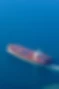 Toma aérea en picado de un gran buque portacontenedores cargado con contenedores rojos y azules navegando por un océano amplio y azul profundo.