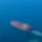 Vista aérea desde la popa de un pequeño buque de carga navegando en aguas tranquilas y azules, dejando olas simétricas y una estela blanca en el agua circundante bajo un cielo despejado.