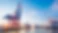 Escena vibrante de la puesta de sol en un importante puerto con varias grúas pórtico rojas y azules y una superficie de agua reflectante bajo un espectacular cielo azul y naranja.